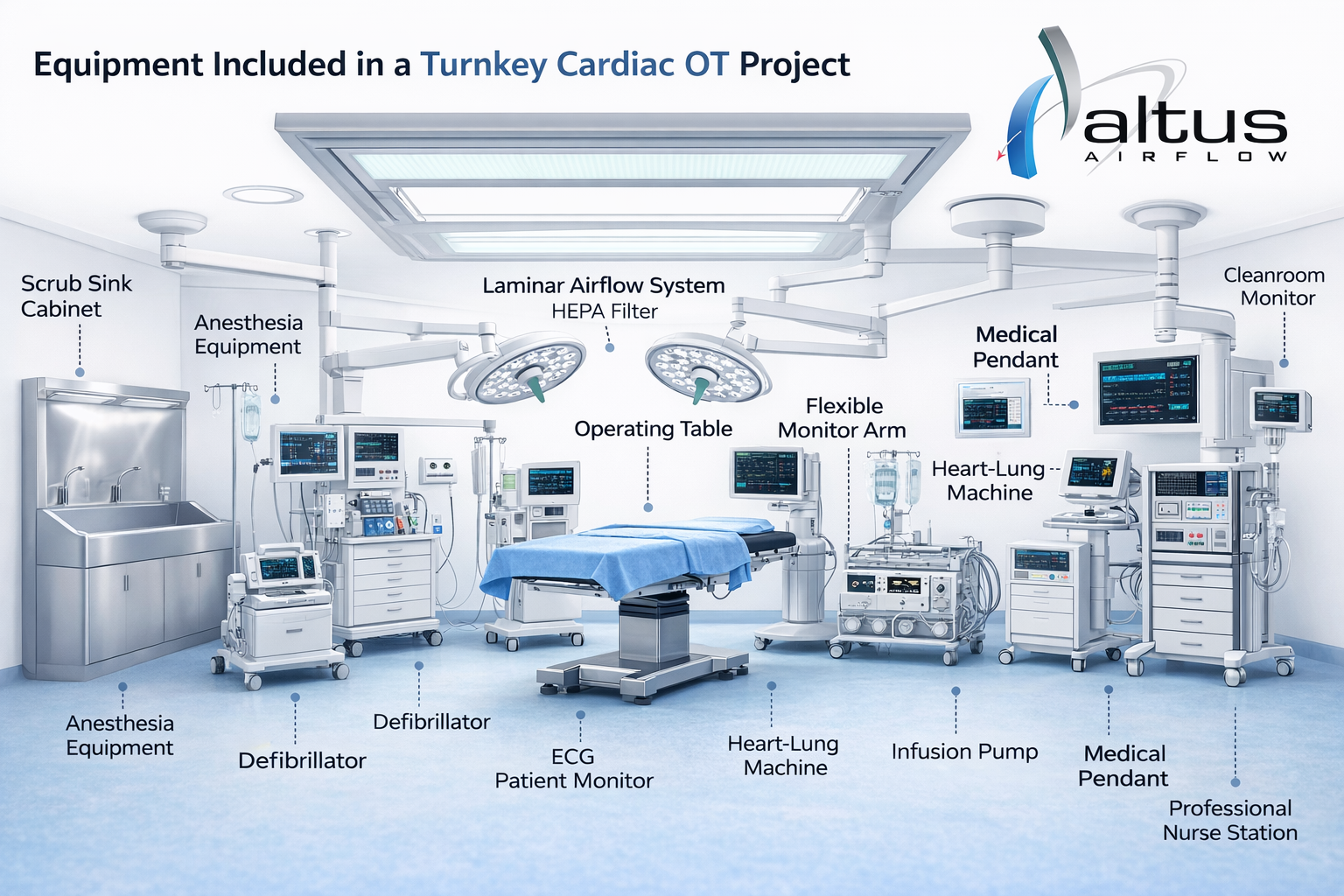 At Altus Airflow, we specialize in providing comprehensive turnkey cardiac OT projects that integrate cutting-edge equipment with advanced airflow systems and cleanroom design. In this blog, we will explore the essential equipment included in a turnkey cardiac OT project and how each component contributes to safety, efficiency, and successful surgical outcomes.